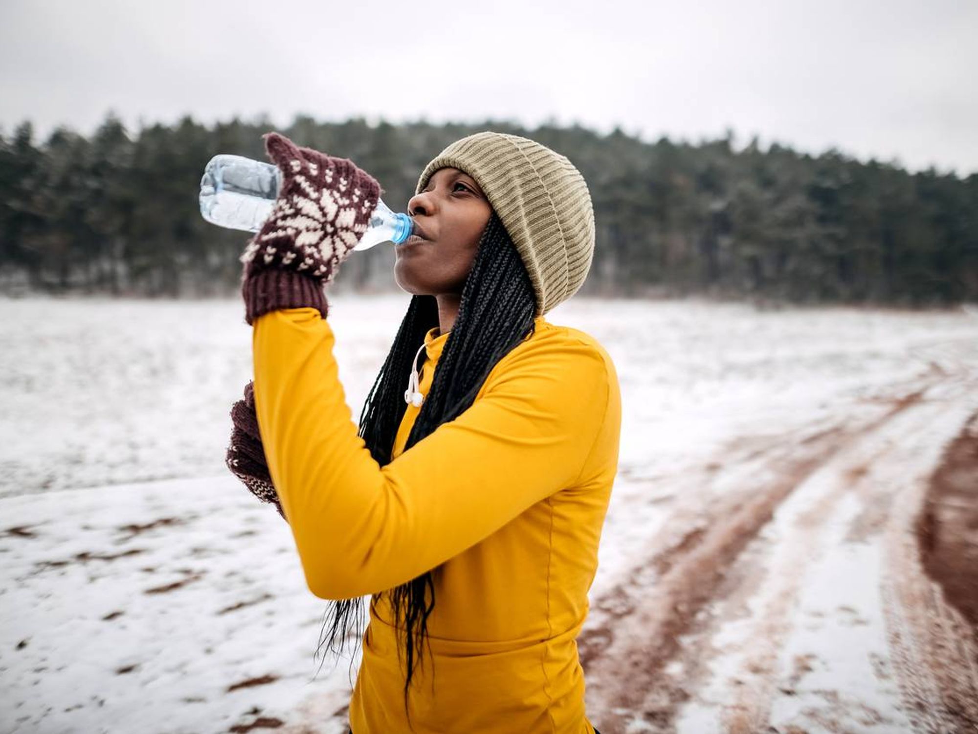 Your thirst drops by up to 40% in the cold, even though you’re losing fluids through breathing and sweating under layers. Hydrate before and after workouts, and during sessions longer than one hour. If ice-cold water doesn’t appeal, try warm tea or cider. Eat a small snack of lean protein and complex carbs one to two hours before exercise to maintain stable blood sugar.